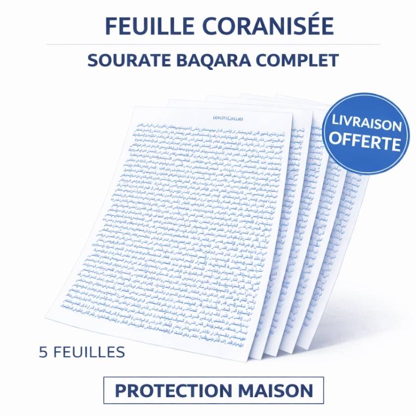 FEUILLES CORANISÉES – SOURATE AL BAQARA COMPLET – PROTECTION MAISON – 5 PAGES