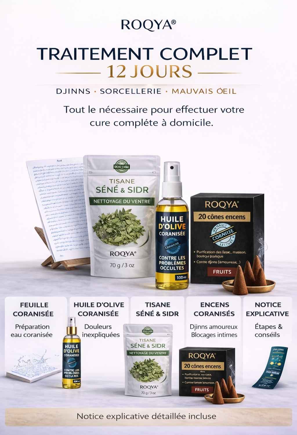 En cas de problèmes occultes, de blocages inexpliqués ou de mal-être persistant, ce traitement vous permet de prendre en main votre roqya, directement depuis votre domicile.
